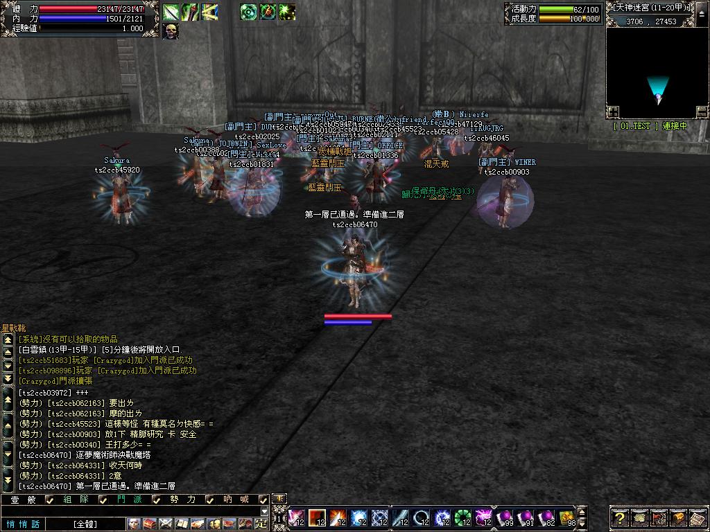第1关任务消灭所有怪物 :此层作为初级关不开金刚小怪攻击伤害100多前提是穿+15神装一套,防御3000左右,大家可以算下如果是不好的装备能否去顶,金刚被破的速度!一层BOSS位于最中间由于怪多人少笔者不敢一堵它的尊容!